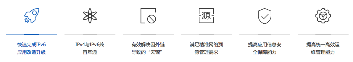 * 融合云服务平台,广泛兼容IPv4和IPv6网络。实现一键部署,网站快速改造,真正无缝过渡到下一代互联网。